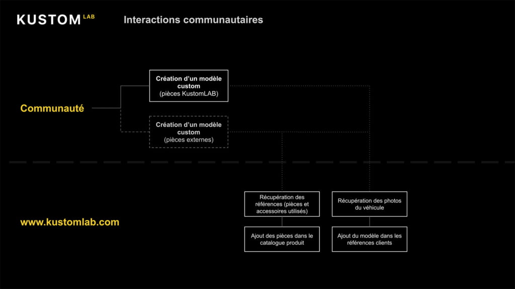 A l’aide d’un configurateur 3D, l’utilisateur peut piocher parmi une liste de pièces compatibles avec son véhicule ou choisir un Pack KustomLAB packs customs et visualiser le rendu en live. Il peut alors les commander pour commencer la transformation.